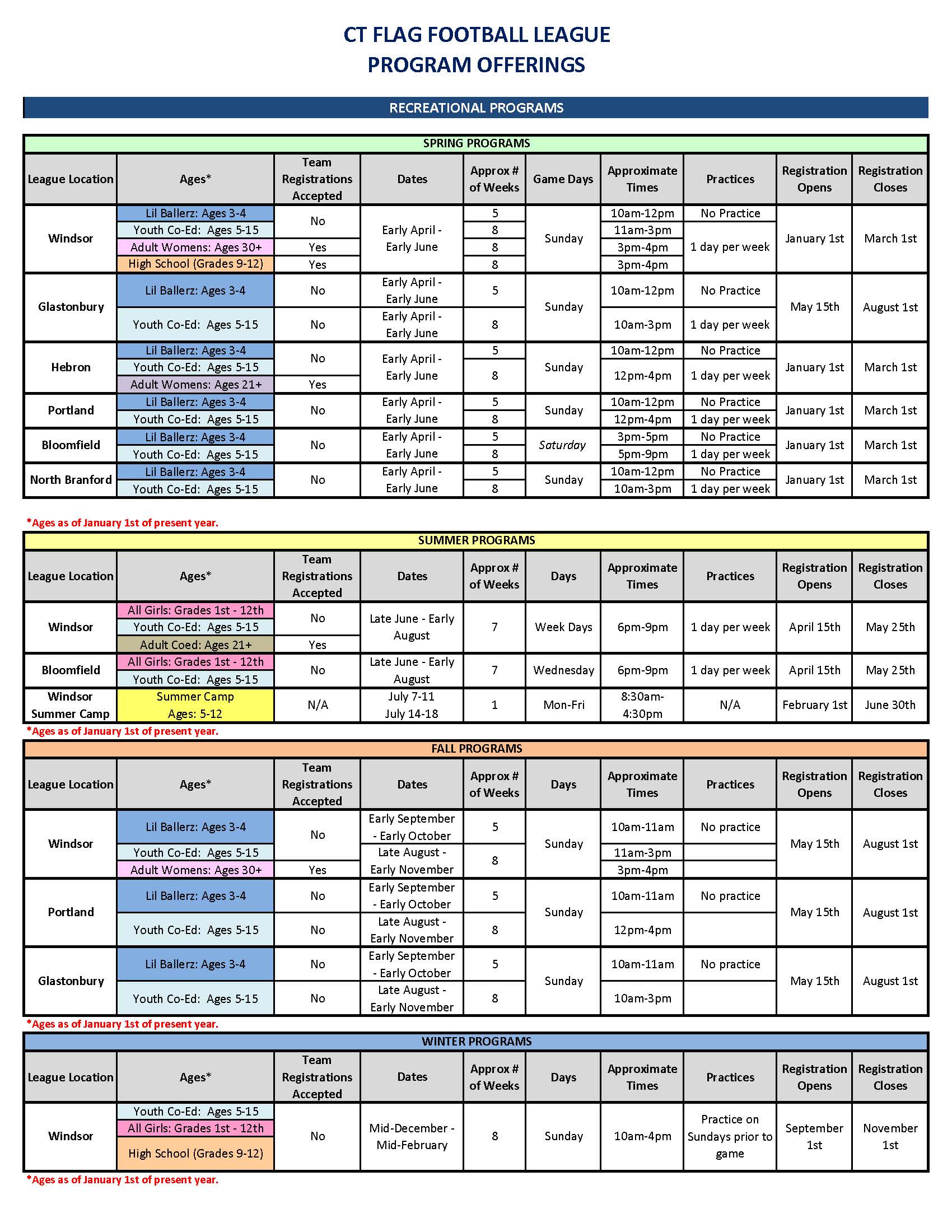 Coed Leagues: Kids are placed on teams within their age groups*. Ages based on January 1st of the current year.